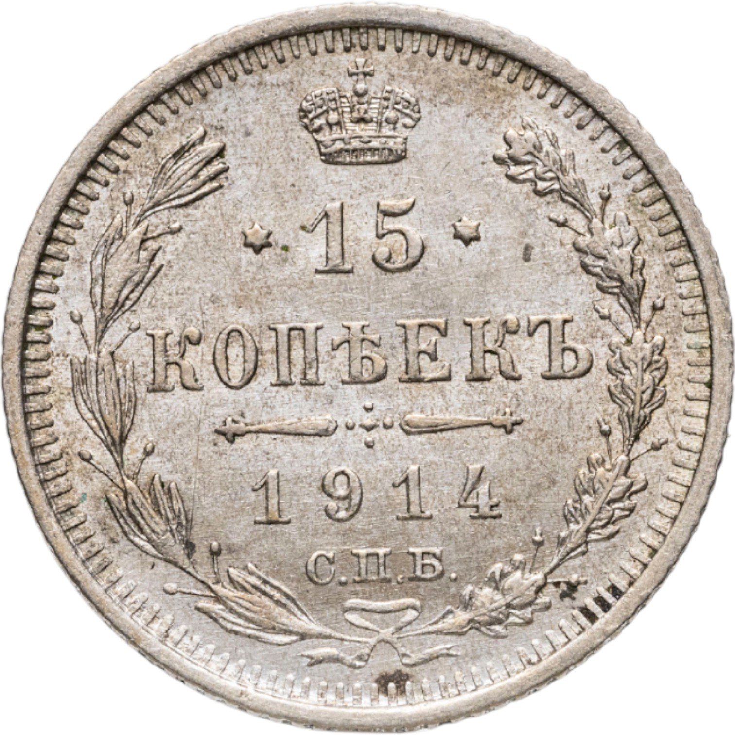 В центре указан номинал «15», ограниченный с обеих сторон звездочками. Над цифрой – Корона Российской империи. Под цифрой номинала — слово "КОПЕЕК". Ниже, расположен декоративный разделитель в виде двух разнонаправленных фигурных линий и стилизованным из точек крестом между ними. Под разделителем — дата выпуска монеты «1914». Под цифрой даты — обозначение монетного двора «С.П.Б.». Вдоль канта, не доходя до короны, изображен венок из лавровой и дубовой ветви, которые в нижней части перевязаны лентой на узел бантом. По окружности канта имеются рельефные элементы, выполненные в виде зубцов.