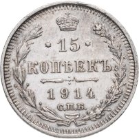 В центре указан номинал «15», ограниченный с обеих сторон звездочками. Над цифрой – Корона Российской империи. Под цифрой номинала — слово "КОПЕЕК". Ниже, расположен декоративный разделитель в виде двух разнонаправленных фигурных линий и стилизованным из точек крестом между ними. Под разделителем — дата выпуска монеты «1914». Под цифрой даты — обозначение монетного двора «С.П.Б.». Вдоль канта, не доходя до короны, изображен венок из лавровой и дубовой ветви, которые в нижней части перевязаны лентой на узел бантом. По окружности канта имеются рельефные элементы, выполненные в виде зубцов.