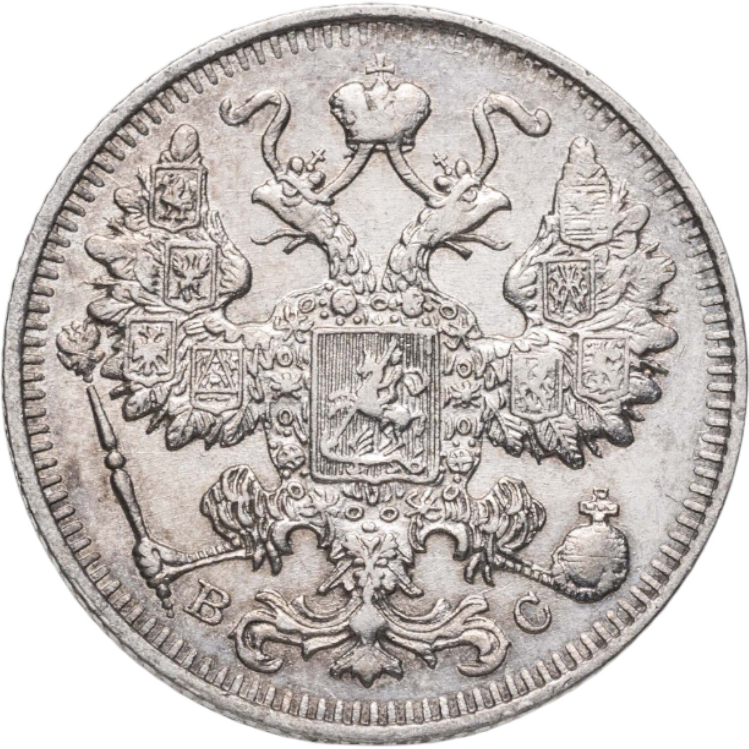 В центре изображен Малый Государственный Герб Российской империи - двуглавый орёл, головы которого увенчаны двумя коронами, третья, большая корона над ними. Все они соединены орденской лентой ордена Св. Апостола Андрея Первозванного. На груди орла расположен Московский герб, в щите изображен Георгий Победоносец с копьем поражающий дракона. Вокруг щита цепь ордена Св. Апостола Андрея Первозванного. На крыльях изображены гербы: Царства Казанского, Польского, Херсонеса Таврического, Астраханского, Сибирского, Грузинского и герб соединенных княжеств Киевского, Новгородского и Владимирского — по 4 на каждое крыло. В правой лапе орла – скипетр, в левой – держава. Под правой лапой – буква «В», под левой – буква «С». Инициалы минцмейстера Виктора Смирнова. По окружности канта имеются рельефные элементы, выполненные в виде зубцов.