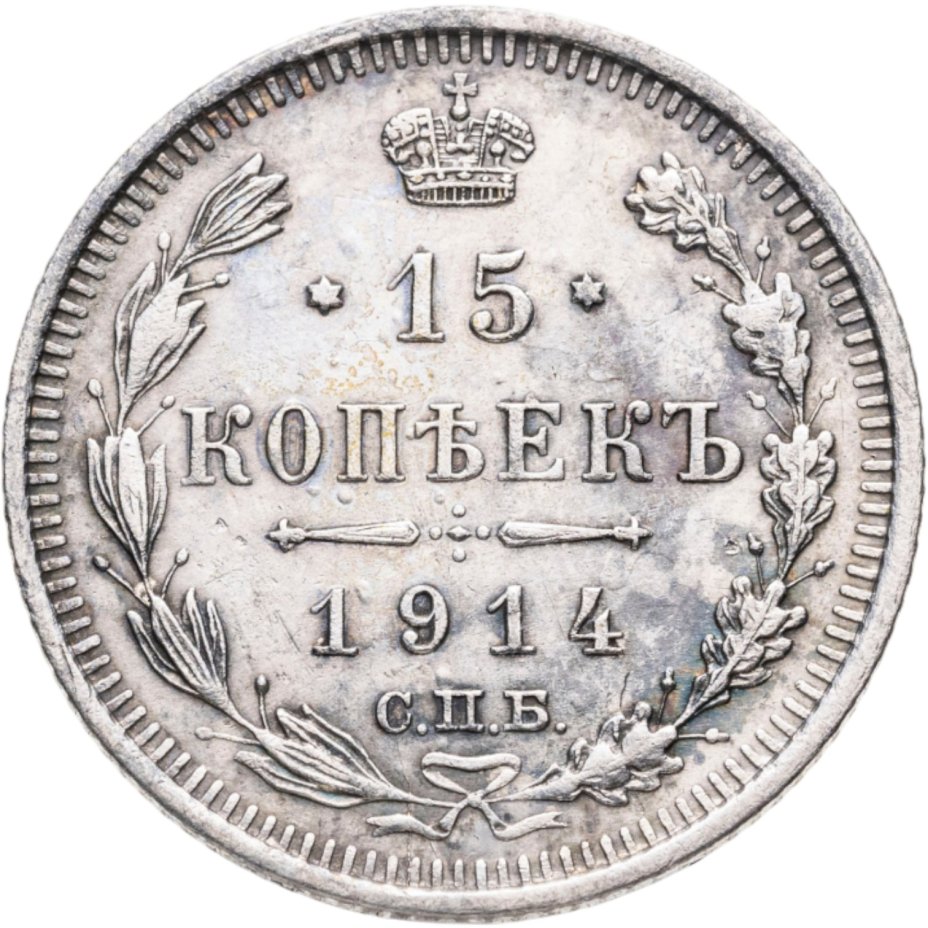 В центре указан номинал «15», ограниченный с обеих сторон звездочками. Над цифрой – Корона Российской империи. Под цифрой номинала — слово "КОПЕЕК". Ниже, расположен декоративный разделитель в виде двух разнонаправленных фигурных линий и стилизованным из точек крестом между ними. Под разделителем — дата выпуска монеты «1914». Под цифрой даты — обозначение монетного двора «С.П.Б.». Вдоль канта, не доходя до короны, изображен венок из лавровой и дубовой ветви, которые в нижней части перевязаны лентой на узел бантом. По окружности канта имеются рельефные элементы, выполненные в виде зубцов.