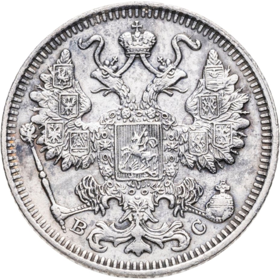В центре изображен Малый Государственный Герб Российской империи - двуглавый орёл, головы которого увенчаны двумя коронами, третья, большая корона над ними. Все они соединены орденской лентой ордена Св. Апостола Андрея Первозванного. На груди орла расположен Московский герб, в щите изображен Георгий Победоносец с копьем поражающий дракона. Вокруг щита цепь ордена Св. Апостола Андрея Первозванного. На крыльях изображены гербы: Царства Казанского, Польского, Херсонеса Таврического, Астраханского, Сибирского, Грузинского и герб соединенных княжеств Киевского, Новгородского и Владимирского — по 4 на каждое крыло. В правой лапе орла – скипетр, в левой – держава. Под правой лапой – буква «В», под левой – буква «С». Инициалы минцмейстера Виктора Смирнова. По окружности канта имеются рельефные элементы, выполненные в виде зубцов.