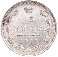В центре указан номинал «15», ограниченный с обеих сторон звездочками. Над цифрой – Корона Российской империи. Под цифрой номинала — слово "КОПЕЕК". Ниже, расположен декоративный разделитель в виде двух разнонаправленных фигурных линий и стилизованным из точек крестом между ними. Под разделителем — дата выпуска монеты «1915». Вдоль канта, не доходя до короны, изображен венок из лавровой и дубовой ветви, которые в нижней части перевязаны лентой на узел бантом. По окружности канта имеются рельефные элементы, выполненные в виде зубцов.