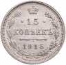 В центре указан номинал «15», ограниченный с обеих сторон звездочками. Над цифрой – Корона Российской империи. Под цифрой номинала — слово "КОПЕЕК". Ниже, расположен декоративный разделитель в виде двух разнонаправленных фигурных линий и стилизованным из точек крестом между ними. Под разделителем — дата выпуска монеты «1915». Вдоль канта, не доходя до короны, изображен венок из лавровой и дубовой ветви, которые в нижней части перевязаны лентой на узел бантом. По окружности канта имеются рельефные элементы, выполненные в виде зубцов.