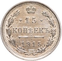 В центре указан номинал «15», ограниченный с обеих сторон звездочками. Над цифрой – Корона Российской империи. Под цифрой номинала — слово "КОПЕЕК". Ниже, расположен декоративный разделитель в виде двух разнонаправленных фигурных линий и стилизованным из точек крестом между ними. Под разделителем — дата выпуска монеты «1915». Вдоль канта, не доходя до короны, изображен венок из лавровой и дубовой ветви, которые в нижней части перевязаны лентой на узел бантом. По окружности канта имеются рельефные элементы, выполненные в виде зубцов.