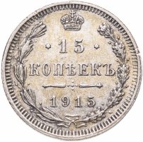 В центре указан номинал «15», ограниченный с обеих сторон звездочками. Над цифрой – Корона Российской империи. Под цифрой номинала — слово "КОПЕЕК". Ниже, расположен декоративный разделитель в виде двух разнонаправленных фигурных линий и стилизованным из точек крестом между ними. Под разделителем — дата выпуска монеты «1915». Вдоль канта, не доходя до короны, изображен венок из лавровой и дубовой ветви, которые в нижней части перевязаны лентой на узел бантом. По окружности канта имеются рельефные элементы, выполненные в виде зубцов.