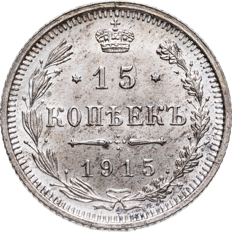 В центре указан номинал «15», ограниченный с обеих сторон звездочками. Над цифрой – Корона Российской империи. Под цифрой номинала — слово "КОПЕЕК". Ниже, расположен декоративный разделитель в виде двух разнонаправленных фигурных линий и стилизованным из точек крестом между ними. Под разделителем — дата выпуска монеты «1915». Вдоль канта, не доходя до короны, изображен венок из лавровой и дубовой ветви, которые в нижней части перевязаны лентой на узел бантом. По окружности канта имеются рельефные элементы, выполненные в виде зубцов.