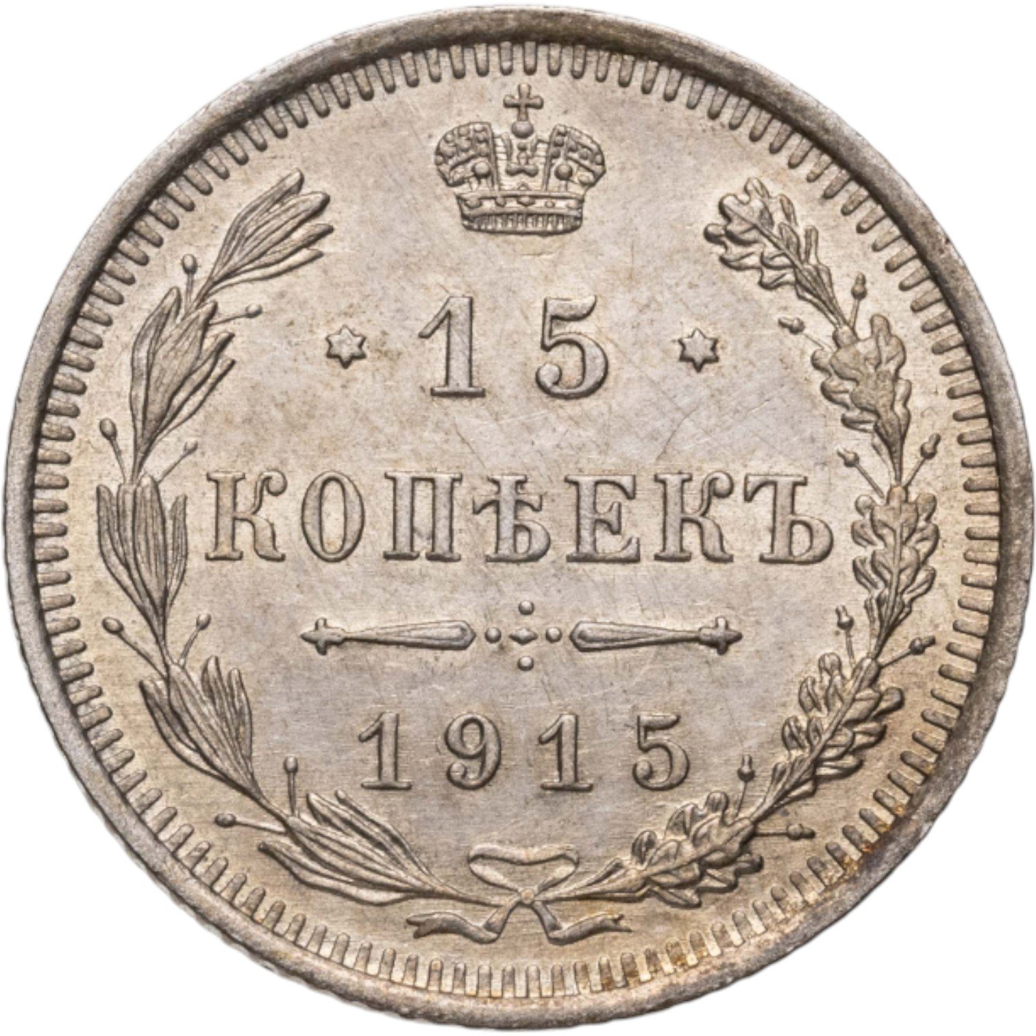 В центре указан номинал «15», ограниченный с обеих сторон звездочками. Над цифрой – Корона Российской империи. Под цифрой номинала — слово "КОПЕЕК". Ниже, расположен декоративный разделитель в виде двух разнонаправленных фигурных линий и стилизованным из точек крестом между ними. Под разделителем — дата выпуска монеты «1915». Вдоль канта, не доходя до короны, изображен венок из лавровой и дубовой ветви, которые в нижней части перевязаны лентой на узел бантом. По окружности канта имеются рельефные элементы, выполненные в виде зубцов.
