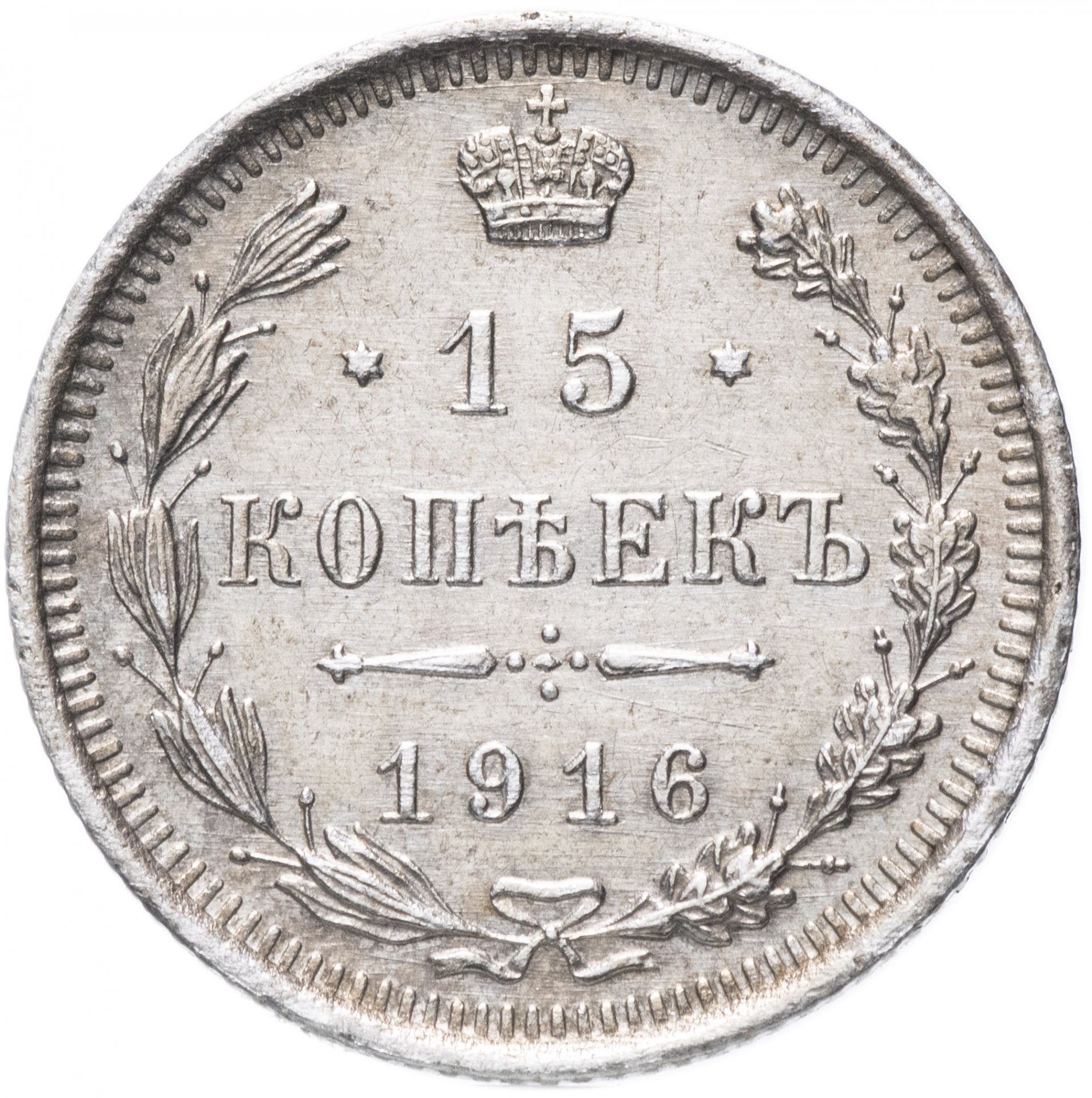 В центре указан номинал «15», ограниченный с обеих сторон звездочками. Над цифрой – Корона Российской империи. Под цифрой номинала — слово "КОПЕЕК". Ниже, расположен декоративный разделитель в виде двух разнонаправленных фигурных линий и стилизованным из точек крестом между ними. Под разделителем — дата выпуска монеты «1916». Вдоль канта, не доходя до короны, изображен венок из лавровой и дубовой ветви, которые в нижней части перевязаны лентой на узел бантом. По окружности канта имеются рельефные элементы, выполненные в виде зубцов.