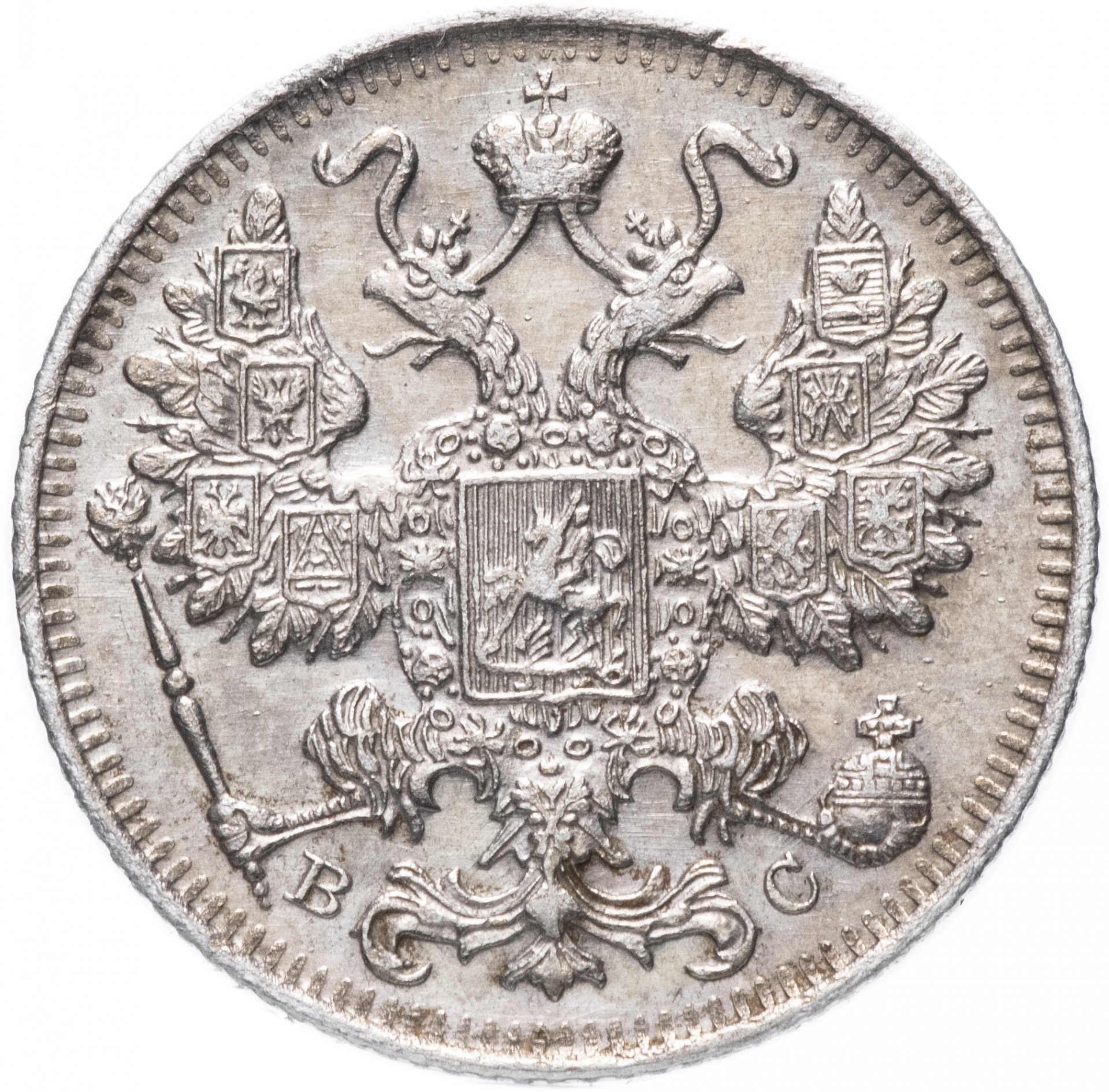 В центре изображен Малый Государственный Герб Российской империи - двуглавый орёл, головы которого увенчаны двумя коронами, третья, большая корона над ними. Все они соединены орденской лентой ордена Св. Апостола Андрея Первозванного. На груди орла расположен Московский герб, в щите изображен Георгий Победоносец с копьем поражающий дракона. Вокруг щита цепь ордена Св. Апостола Андрея Первозванного. На крыльях изображены гербы: Царства Казанского, Польского, Херсонеса Таврического, Астраханского, Сибирского, Грузинского и герб соединенных княжеств Киевского, Новгородского и Владимирского — по 4 на каждое крыло. В правой лапе орла – скипетр, в левой – держава. Под правой лапой – буква «В», под левой – буква «С». Инициалы минцмейстера Виктора Смирнова. По окружности канта имеются рельефные элементы, выполненные в виде зубцов.