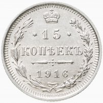 В центре указан номинал «15», ограниченный с обеих сторон звездочками. Над цифрой – Корона Российской империи. Под цифрой номинала — слово "КОПЕЕК". Ниже, расположен декоративный разделитель в виде двух разнонаправленных фигурных линий и стилизованным из точек крестом между ними. Под разделителем — дата выпуска монеты «1916». Вдоль канта, не доходя до короны, изображен венок из лавровой и дубовой ветви, которые в нижней части перевязаны лентой на узел бантом. По окружности канта имеются рельефные элементы, выполненные в виде зубцов.