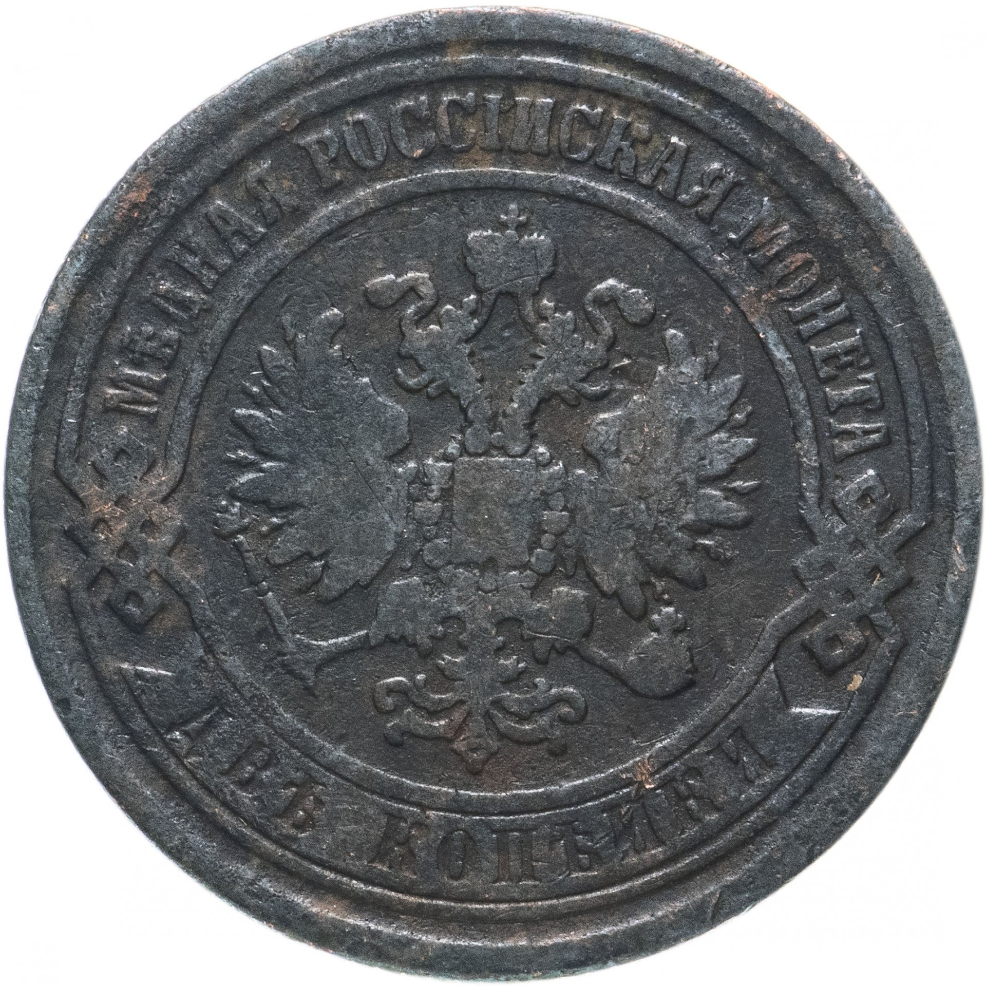 В центре монеты изображен Малый Государственный Герб Российской империи - двуглавый орел, головы которого увенчаны двумя коронами, третья, большая корона над ними. Все они соединены лентой Андрея Первозванного. В правой лапе орла – скипетр, в левой – держава. На его груди расположен Московский герб, в щите изображен Георгий Победоносец с копьем поражающий дракона. Вокруг щита цепь ордена Св. Апостола Андрея Первозванного. На крыльях орла изображены гербы: Царства Казанского, Польского, Херсонеса Таврического, Астраханского, Сибирского, Грузинского и герб соединенных княжеств Киевского, Новгородского и Владимирского — по 4 на каждое крыло. По окружности - две полукруглые плашки, соединенные узорами. На верхней плашке выпуклая надпись: "МЕДНАЯ РОССИЙСКАЯ МОНЕТА". На нижней плашке, изображенной в виде ленты, углубленная надпись: "ДВЕ КОПЕЙКИ".