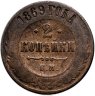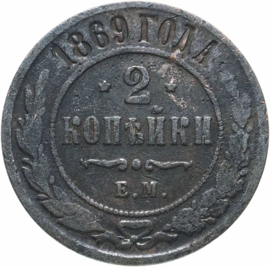 В центре указан номинал «2», ограниченный с обеих сторон звездочками. Под цифрой номинала слово — "КОПЕЙКИ". Ниже, расположен декоративный разделитель в виде двух изогнутых линий и небольшой окружности между ними. Под линиями обозначение монетного двора «Е.М.». Центральная часть отделена от остального изображения, окружностью в виде точек. В верхней части по кругу углубленная надпись: "1869 ГОДА". Ниже этой надписи, вдоль канта, изображен венок из лавровой и дубовой ветви, которые в нижней части перевязаны лентой на узел бантом.
