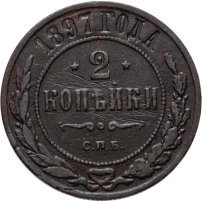 В центре указан номинал — цифра «2», ограниченная с обеих сторон звездочками. Под цифрой номинала — слово "КОПЕЙКИ". Ниже, расположен декоративный разделитель в виде двух изогнутых линий и небольшой окружности между ними. Под разделителем — обозначение монетного двора «С.П.Б.». Центральная часть отделена от остального изображения, окружностью в виде точек. В верхней части полукругом углубленная надпись: "1897 ГОДА". Ниже этой надписи, вдоль канта, изображен венок из лавровой и дубовой ветвей, которые, в нижней части, перевязаны лентой на узел бантом.