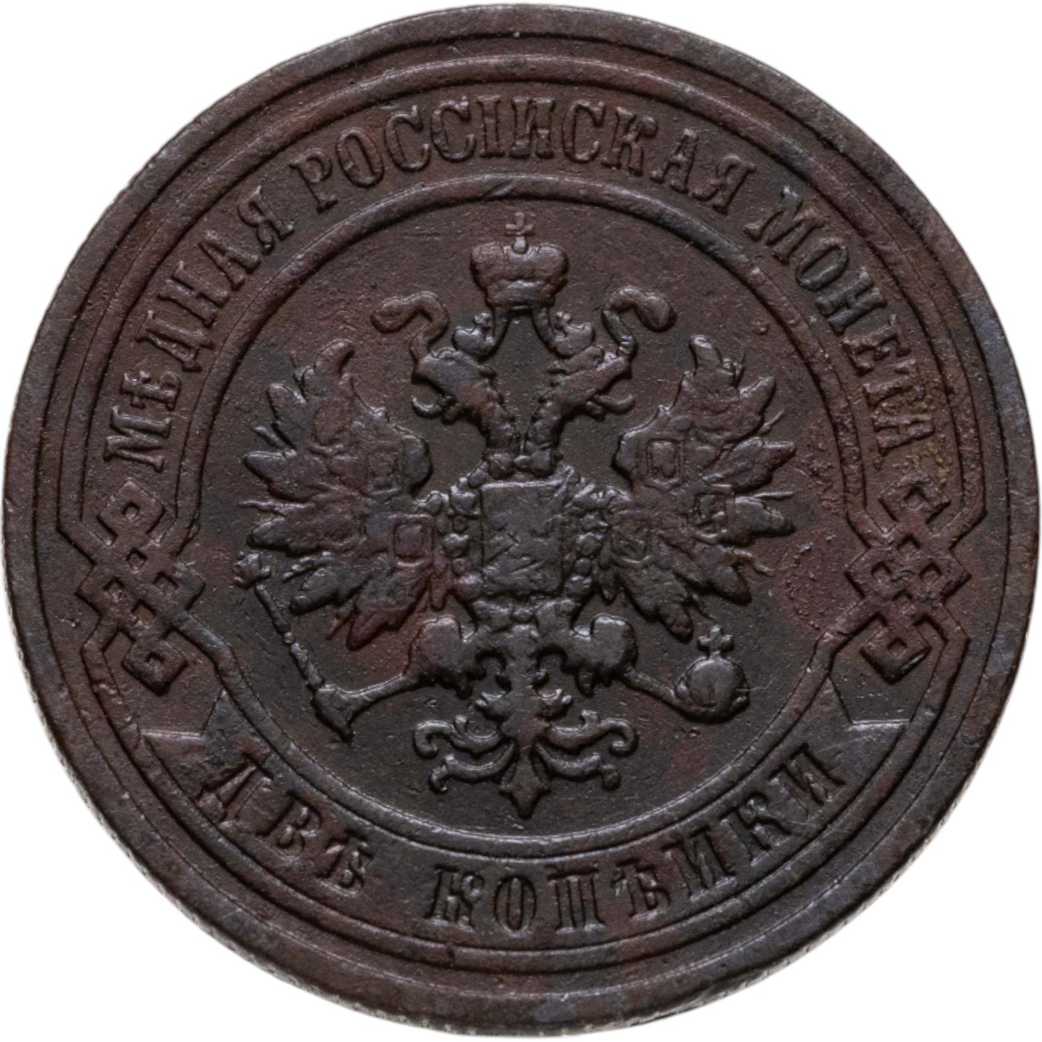 В центре монеты изображен Малый Государственный Герб Российской империи - двуглавый орел, головы которого увенчаны двумя коронами, третья, большая корона над ними. Все они соединены лентой Андрея Первозванного. В правой лапе орла – скипетр, в левой – держава. На его груди расположен Московский герб, в щите изображен Георгий Победоносец с копьем поражающий дракона. Вокруг щита цепь ордена Св. Апостола Андрея Первозванного. На крыльях орла изображены гербы: Царства Казанского, Польского, Херсонеса Таврического, Астраханского, Сибирского, Грузинского и герб соединенных княжеств Киевского, Новгородского и Владимирского — по 4 на каждое крыло. По окружности - две полукруглые плашки, соединенные узорами. На верхней плашке выпуклая надпись: "МЕДНАЯ РОССИЙСКАЯ МОНЕТА". На нижней плашке, изображенной в виде ленты, углубленная надпись: "ДВЕ КОПЕЙКИ".