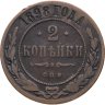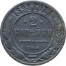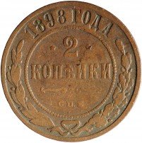 В центре указан номинал — цифра «2», ограниченная с обеих сторон звездочками. Под цифрой номинала — слово "КОПЕЙКИ". Ниже, расположен декоративный разделитель в виде двух изогнутых линий и небольшой окружности между ними. Под разделителем — обозначение монетного двора «С.П.Б.». Центральная часть отделена от остального изображения, окружностью в виде точек. В верхней части полукругом углубленная надпись: "1898 ГОДА". Ниже этой надписи, вдоль канта, изображен венок из лавровой и дубовой ветвей, которые, в нижней части, перевязаны лентой на узел бантом.