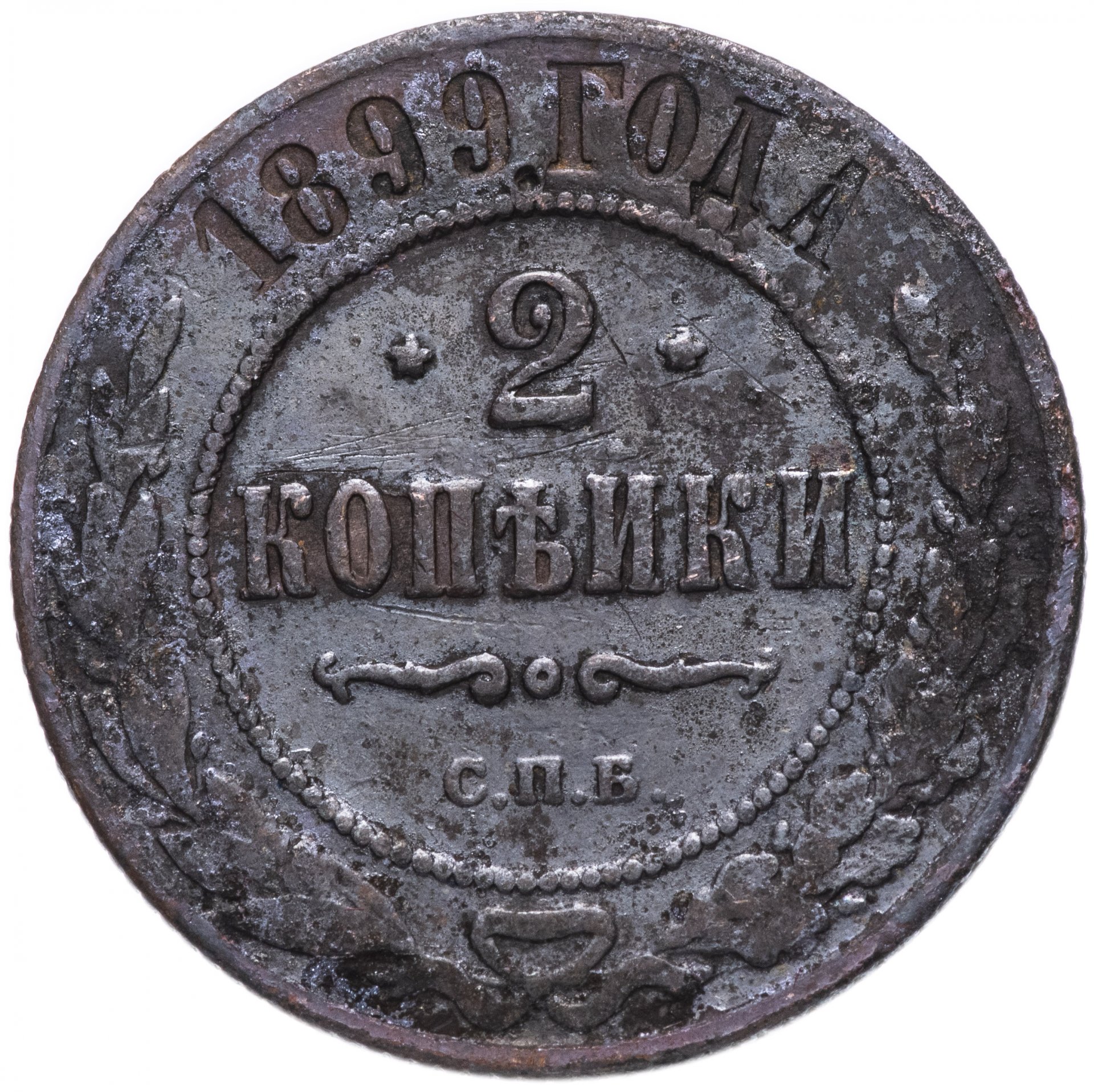 В центре указан номинал — цифра «2», ограниченная с обеих сторон звездочками. Под цифрой номинала — слово "КОПЕЙКИ". Ниже, расположен декоративный разделитель в виде двух изогнутых линий и небольшой окружности между ними. Под разделителем — обозначение монетного двора «С.П.Б.». Центральная часть отделена от остального изображения, окружностью в виде точек. В верхней части полукругом углубленная надпись: "1899 ГОДА". Ниже этой надписи, вдоль канта, изображен венок из лавровой и дубовой ветвей, которые, в нижней части, перевязаны лентой на узел бантом.