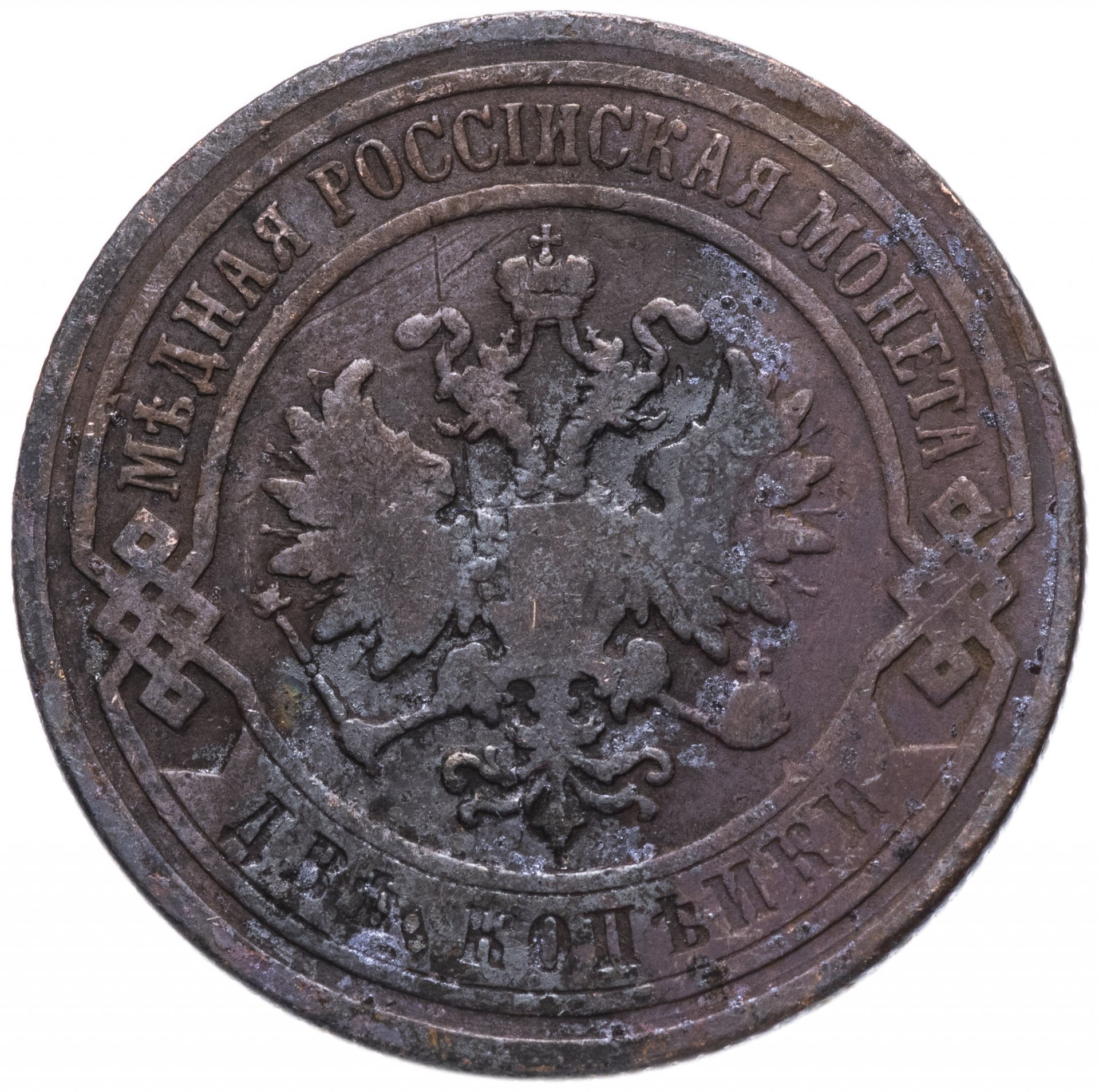 В центре монеты изображен Малый Государственный Герб Российской империи - двуглавый орел, головы которого увенчаны двумя коронами, третья, большая корона над ними. Все они соединены лентой Андрея Первозванного. В правой лапе орла – скипетр, в левой – держава. На его груди расположен Московский герб, в щите изображен Георгий Победоносец с копьем поражающий дракона. Вокруг щита цепь ордена Св. Апостола Андрея Первозванного. На крыльях орла изображены гербы: Царства Казанского, Польского, Херсонеса Таврического, Астраханского, Сибирского, Грузинского и герб соединенных княжеств Киевского, Новгородского и Владимирского — по 4 на каждое крыло. По окружности - две полукруглые плашки, соединенные узорами. На верхней плашке выпуклая надпись: "МЕДНАЯ РОССИЙСКАЯ МОНЕТА". На нижней плашке, изображенной в виде ленты, углубленная надпись: "ДВЕ КОПЕЙКИ".