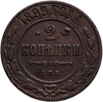 В центре указан номинал — цифра «2», ограниченная с обеих сторон звездочками. Под цифрой номинала — слово "КОПЕЙКИ". Ниже, расположен декоративный разделитель в виде двух изогнутых линий и небольшой окружности между ними. Под разделителем — обозначение монетного двора «С.П.Б.». Центральная часть отделена от остального изображения, окружностью в виде точек. В верхней части полукругом углубленная надпись: "1899 ГОДА". Ниже этой надписи, вдоль канта, изображен венок из лавровой и дубовой ветвей, которые, в нижней части, перевязаны лентой на узел бантом.