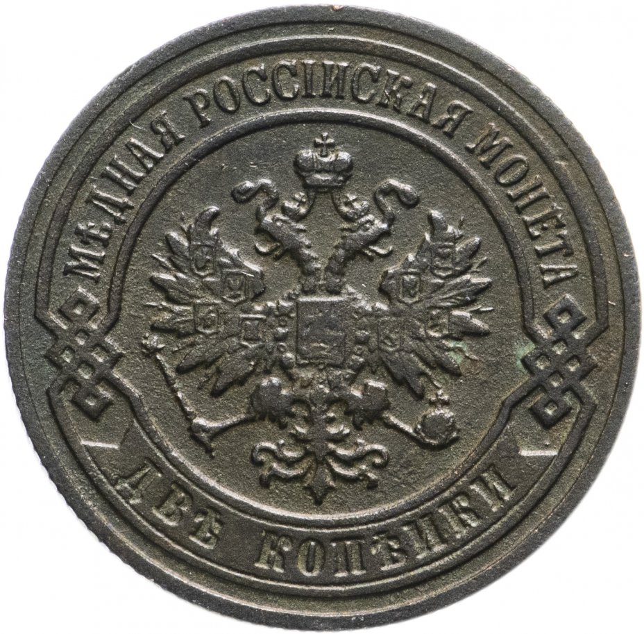 В центре монеты изображен Малый Государственный Герб Российской империи - двуглавый орел, головы которого увенчаны двумя коронами, третья, большая корона над ними. Все они соединены лентой Андрея Первозванного. В правой лапе орла – скипетр, в левой – держава. На его груди расположен Московский герб, в щите изображен Георгий Победоносец с копьем поражающий дракона. Вокруг щита цепь ордена Св. Апостола Андрея Первозванного. На крыльях орла изображены гербы: Царства Казанского, Польского, Херсонеса Таврического, Астраханского, Сибирского, Грузинского и герб соединенных княжеств Киевского, Новгородского и Владимирского — по 4 на каждое крыло. По окружности - две полукруглые плашки, соединенные узорами. На верхней плашке выпуклая надпись: "МЕДНАЯ РОССИЙСКАЯ МОНЕТА". На нижней плашке, изображенной в виде ленты, углубленная надпись: "ДВЕ КОПЕЙКИ".