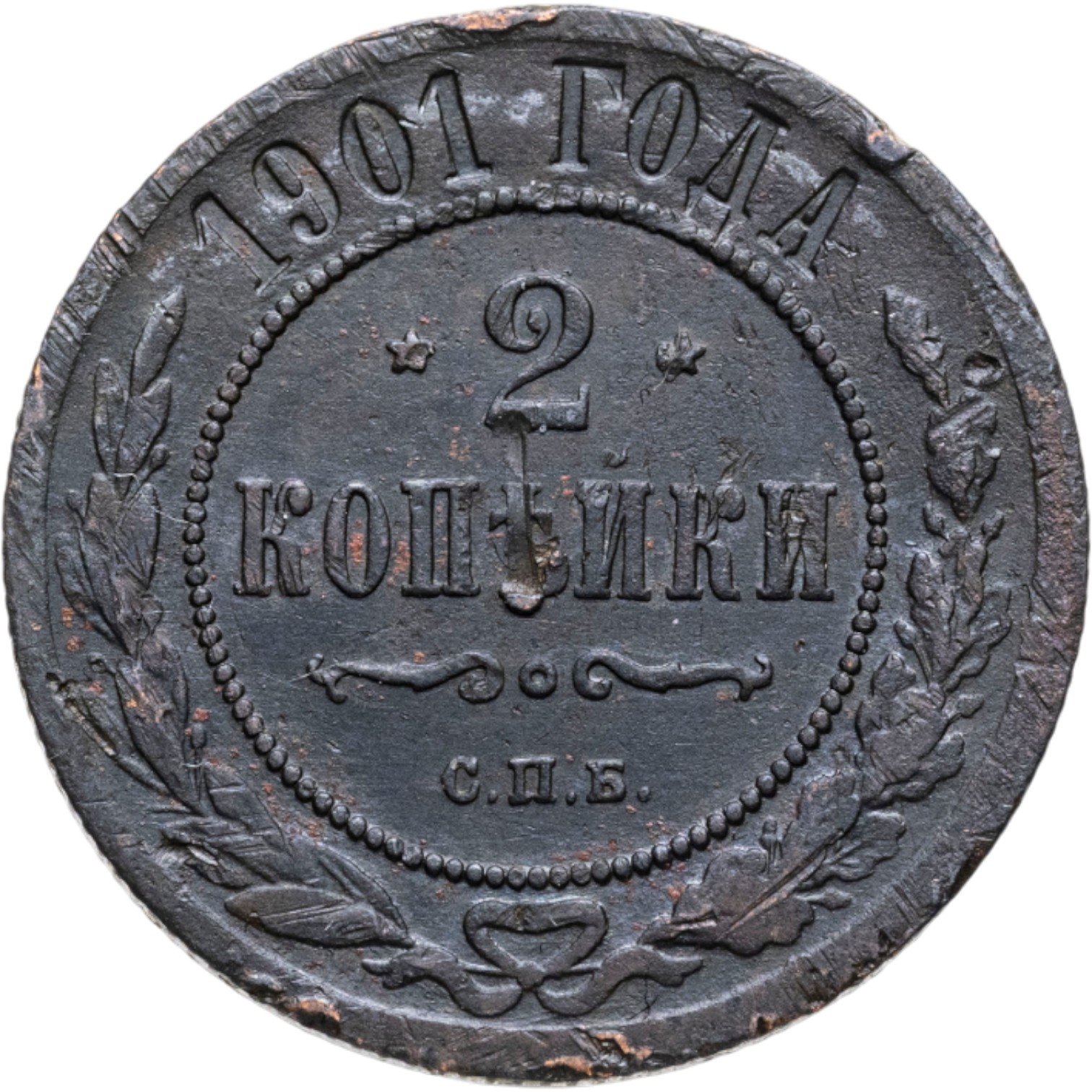 В центре указан номинал — цифра «2», ограниченная с обеих сторон звездочками. Под цифрой номинала — слово "КОПЕЙКИ". Ниже, расположен декоративный разделитель в виде двух изогнутых линий и небольшой окружности между ними. Под разделителем — обозначение монетного двора «С.П.Б.». Центральная часть отделена от остального изображения, окружностью в виде точек. В верхней части полукругом углубленная надпись: "1901 ГОДА". Ниже этой надписи, вдоль канта, изображен венок из лавровой и дубовой ветвей, которые, в нижней части, перевязаны лентой на узел бантом.