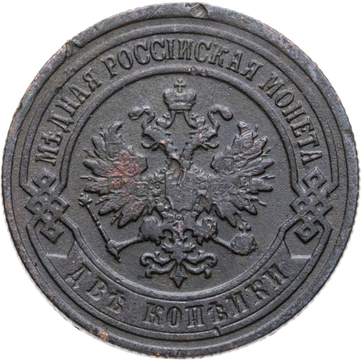 В центре монеты изображен Малый Государственный Герб Российской империи - двуглавый орел, головы которого увенчаны двумя коронами, третья, большая корона над ними. Все они соединены лентой Андрея Первозванного. В правой лапе орла – скипетр, в левой – держава. На его груди расположен Московский герб, в щите изображен Георгий Победоносец с копьем поражающий дракона. Вокруг щита цепь ордена Св. Апостола Андрея Первозванного. На крыльях орла изображены гербы: Царства Казанского, Польского, Херсонеса Таврического, Астраханского, Сибирского, Грузинского и герб соединенных княжеств Киевского, Новгородского и Владимирского — по 4 на каждое крыло. По окружности - две полукруглые плашки, соединенные узорами. На верхней плашке выпуклая надпись: "МЕДНАЯ РОССИЙСКАЯ МОНЕТА". На нижней плашке, изображенной в виде ленты, углубленная надпись: "ДВЕ КОПЕЙКИ".