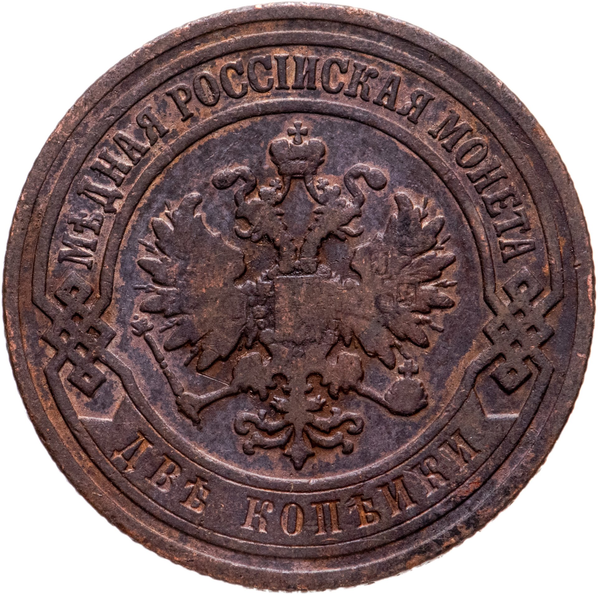 В центре монеты изображен Малый Государственный Герб Российской империи - двуглавый орел, головы которого увенчаны двумя коронами, третья, большая корона над ними. Все они соединены лентой Андрея Первозванного. В правой лапе орла – скипетр, в левой – держава. На его груди расположен Московский герб, в щите изображен Георгий Победоносец с копьем поражающий дракона. Вокруг щита цепь ордена Св. Апостола Андрея Первозванного. На крыльях орла изображены гербы: Царства Казанского, Польского, Херсонеса Таврического, Астраханского, Сибирского, Грузинского и герб соединенных княжеств Киевского, Новгородского и Владимирского — по 4 на каждое крыло. По окружности - две полукруглые плашки, соединенные узорами. На верхней плашке выпуклая надпись: "МЕДНАЯ РОССИЙСКАЯ МОНЕТА". На нижней плашке, изображенной в виде ленты, углубленная надпись: "ДВЕ КОПЕЙКИ".
