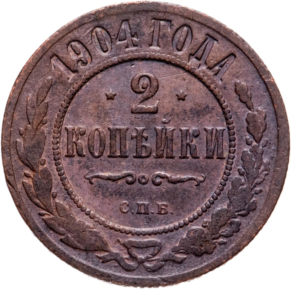 В центре указан номинал — цифра «2», ограниченная с обеих сторон звездочками. Под цифрой номинала — слово "КОПЕЙКИ". Ниже, расположен декоративный разделитель в виде двух изогнутых линий и небольшой окружности между ними. Под разделителем — обозначение монетного двора «С.П.Б.». Центральная часть отделена от остального изображения, окружностью в виде точек. В верхней части полукругом углубленная надпись: "1904 ГОДА". Ниже этой надписи, вдоль канта, изображен венок из лавровой и дубовой ветвей, которые, в нижней части, перевязаны лентой на узел бантом.