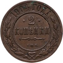 В центре указан номинал — цифра «2», ограниченная с обеих сторон звездочками. Под цифрой номинала — слово "КОПЕЙКИ". Ниже, расположен декоративный разделитель в виде двух изогнутых линий и небольшой окружности между ними. Под разделителем — обозначение монетного двора «С.П.Б.». Центральная часть отделена от остального изображения, окружностью в виде точек. В верхней части полукругом углубленная надпись: "1904 ГОДА". Ниже этой надписи, вдоль канта, изображен венок из лавровой и дубовой ветвей, которые, в нижней части, перевязаны лентой на узел бантом.