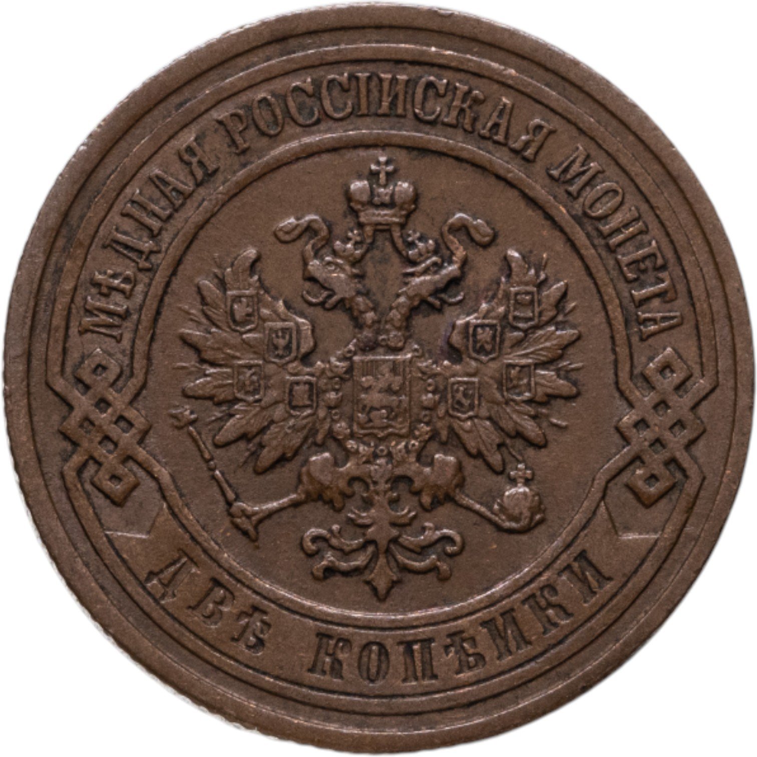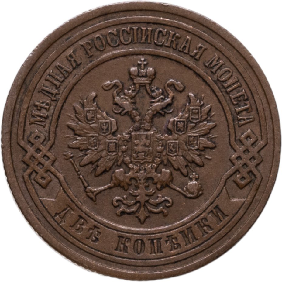 В центре монеты изображен Малый Государственный Герб Российской империи - двуглавый орел, головы которого увенчаны двумя коронами, третья, большая корона над ними. Все они соединены лентой Андрея Первозванного. В правой лапе орла – скипетр, в левой – держава. На его груди расположен Московский герб, в щите изображен Георгий Победоносец с копьем поражающий дракона. Вокруг щита цепь ордена Св. Апостола Андрея Первозванного. На крыльях орла изображены гербы: Царства Казанского, Польского, Херсонеса Таврического, Астраханского, Сибирского, Грузинского и герб соединенных княжеств Киевского, Новгородского и Владимирского — по 4 на каждое крыло. По окружности - две полукруглые плашки, соединенные узорами. На верхней плашке выпуклая надпись: "МЕДНАЯ РОССИЙСКАЯ МОНЕТА". На нижней плашке, изображенной в виде ленты, углубленная надпись: "ДВЕ КОПЕЙКИ".