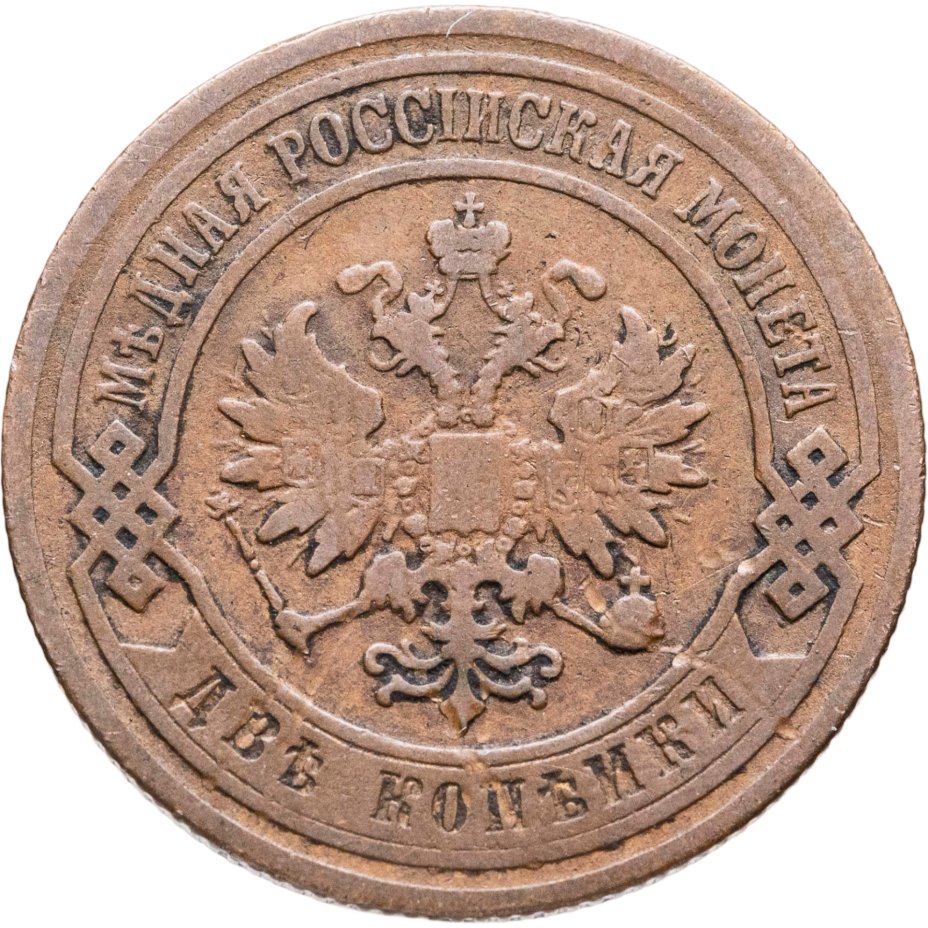 В центре монеты изображен Малый Государственный Герб Российской империи - двуглавый орел, головы которого увенчаны двумя коронами, третья, большая корона над ними. Все они соединены лентой Андрея Первозванного. В правой лапе орла – скипетр, в левой – держава. На его груди расположен Московский герб, в щите изображен Георгий Победоносец с копьем поражающий дракона. Вокруг щита цепь ордена Св. Апостола Андрея Первозванного. На крыльях орла изображены гербы: Царства Казанского, Польского, Херсонеса Таврического, Астраханского, Сибирского, Грузинского и герб соединенных княжеств Киевского, Новгородского и Владимирского — по 4 на каждое крыло. По окружности - две полукруглые плашки, соединенные узорами. На верхней плашке выпуклая надпись: "МЕДНАЯ РОССИЙСКАЯ МОНЕТА". На нижней плашке, изображенной в виде ленты, углубленная надпись: "ДВЕ КОПЕЙКИ".