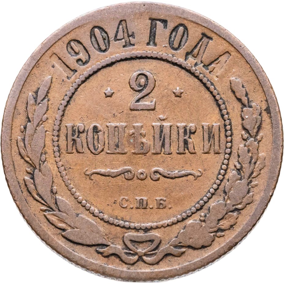 В центре указан номинал — цифра «2», ограниченная с обеих сторон звездочками. Под цифрой номинала — слово "КОПЕЙКИ". Ниже, расположен декоративный разделитель в виде двух изогнутых линий и небольшой окружности между ними. Под разделителем — обозначение монетного двора «С.П.Б.». Центральная часть отделена от остального изображения, окружностью в виде точек. В верхней части полукругом углубленная надпись: "1904 ГОДА". Ниже этой надписи, вдоль канта, изображен венок из лавровой и дубовой ветвей, которые, в нижней части, перевязаны лентой на узел бантом.
