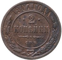 В центре указан номинал — цифра «2», ограниченная с обеих сторон звездочками. Под цифрой номинала — слово "КОПЕЙКИ". Ниже, расположен декоративный разделитель в виде двух изогнутых линий и небольшой окружности между ними. Под разделителем — обозначение монетного двора «С.П.Б.». Центральная часть отделена от остального изображения, окружностью в виде точек. В верхней части полукругом углубленная надпись: "1907 ГОДА". Ниже этой надписи, вдоль канта, изображен венок из лавровой и дубовой ветвей, которые, в нижней части, перевязаны лентой на узел бантом.