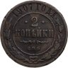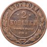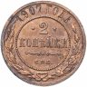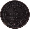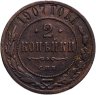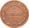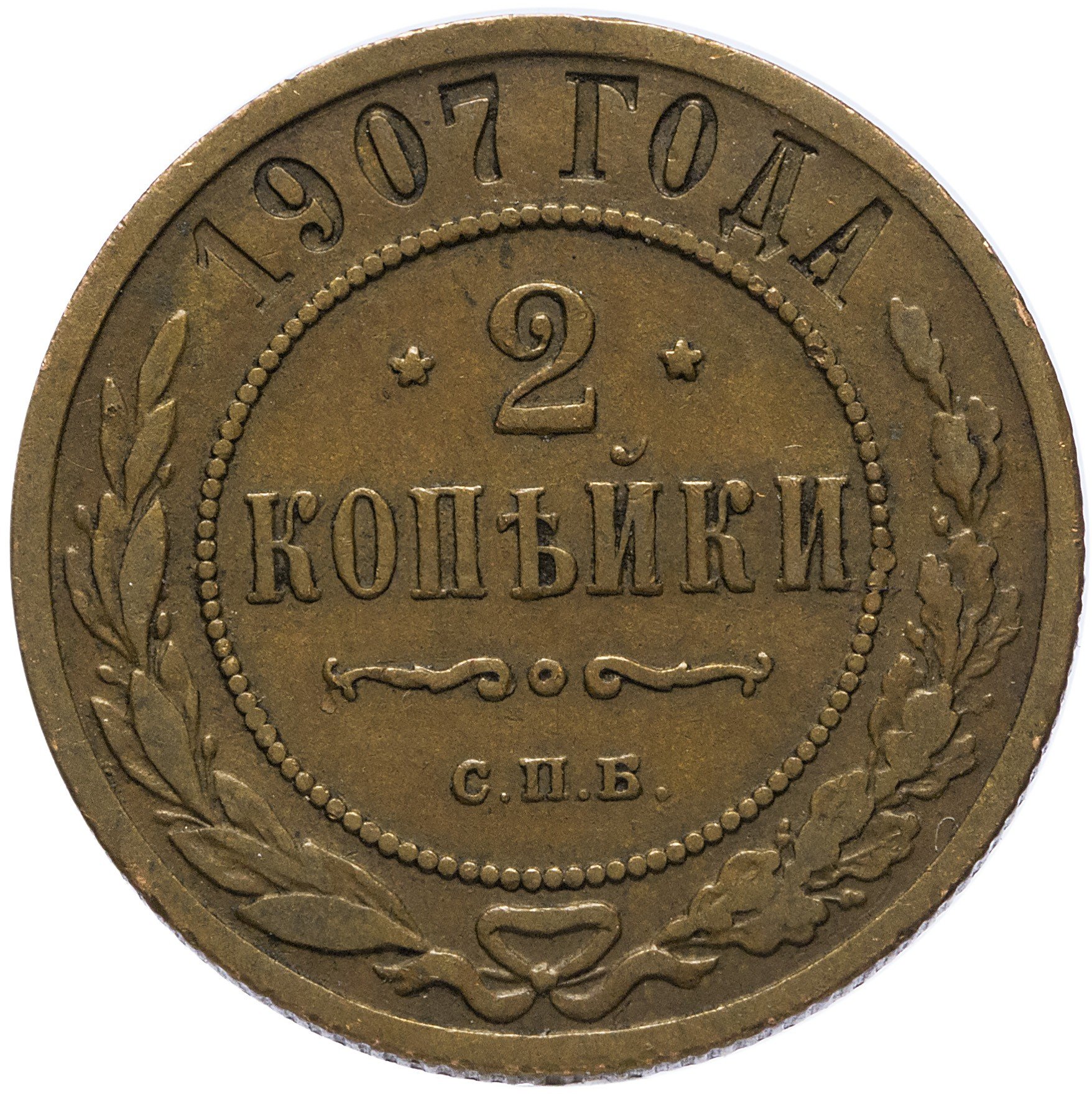 В центре указан номинал — цифра «2», ограниченная с обеих сторон звездочками. Под цифрой номинала — слово "КОПЕЙКИ". Ниже, расположен декоративный разделитель в виде двух изогнутых линий и небольшой окружности между ними. Под разделителем — обозначение монетного двора «С.П.Б.». Центральная часть отделена от остального изображения, окружностью в виде точек. В верхней части полукругом углубленная надпись: "1907 ГОДА". Ниже этой надписи, вдоль канта, изображен венок из лавровой и дубовой ветвей, которые, в нижней части, перевязаны лентой на узел бантом.