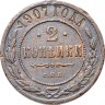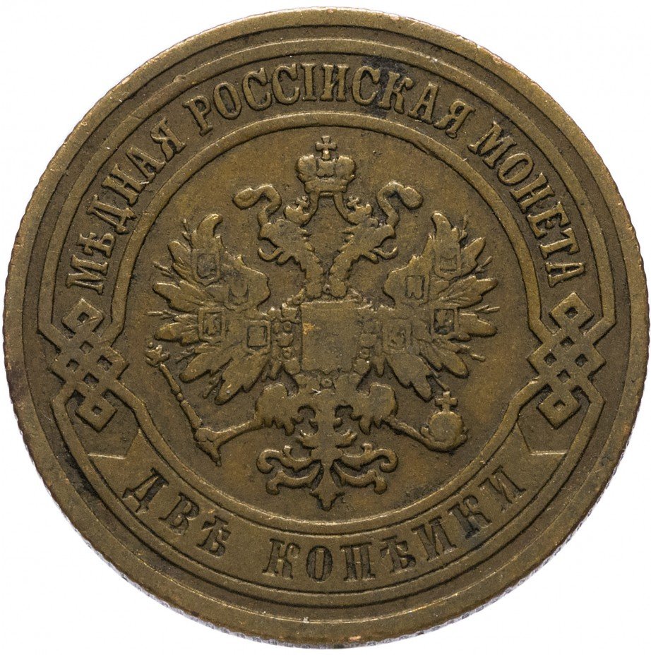 В центре монеты изображен Малый Государственный Герб Российской империи - двуглавый орел, головы которого увенчаны двумя коронами, третья, большая корона над ними. Все они соединены лентой Андрея Первозванного. В правой лапе орла – скипетр, в левой – держава. На его груди расположен Московский герб, в щите изображен Георгий Победоносец с копьем поражающий дракона. Вокруг щита цепь ордена Св. Апостола Андрея Первозванного. На крыльях орла изображены гербы: Царства Казанского, Польского, Херсонеса Таврического, Астраханского, Сибирского, Грузинского и герб соединенных княжеств Киевского, Новгородского и Владимирского — по 4 на каждое крыло. По окружности - две полукруглые плашки, соединенные узорами. На верхней плашке выпуклая надпись: "МЕДНАЯ РОССИЙСКАЯ МОНЕТА". На нижней плашке, изображенной в виде ленты, углубленная надпись: "ДВЕ КОПЕЙКИ".
