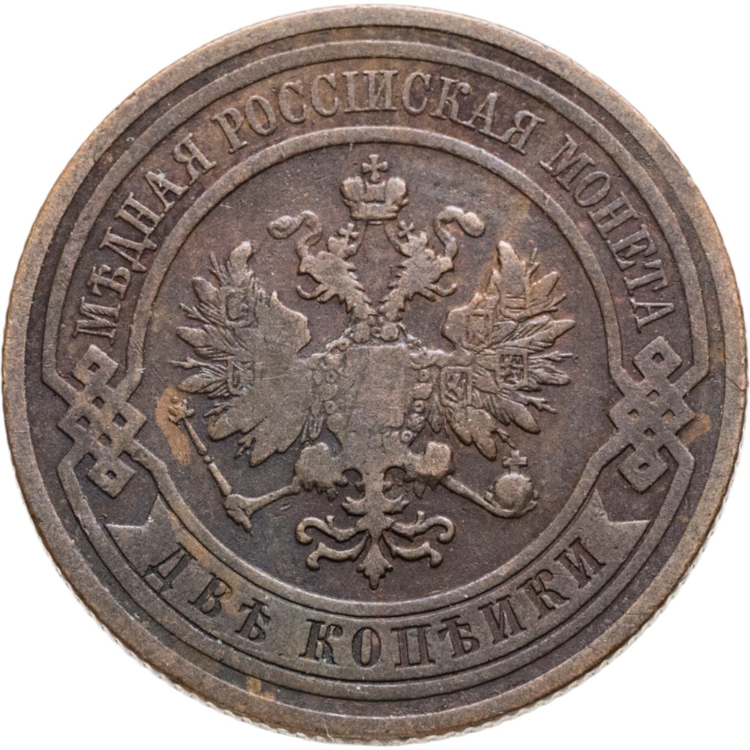 В центре монеты изображен Малый Государственный Герб Российской империи - двуглавый орел, головы которого увенчаны двумя коронами, третья, большая корона над ними. Все они соединены лентой Андрея Первозванного. В правой лапе орла – скипетр, в левой – держава. На его груди расположен Московский герб, в щите изображен Георгий Победоносец с копьем поражающий дракона. Вокруг щита цепь ордена Св. Апостола Андрея Первозванного. На крыльях орла изображены гербы: Царства Казанского, Польского, Херсонеса Таврического, Астраханского, Сибирского, Грузинского и герб соединенных княжеств Киевского, Новгородского и Владимирского — по 4 на каждое крыло. По окружности - две полукруглые плашки, соединенные узорами. На верхней плашке выпуклая надпись: "МЕДНАЯ РОССИЙСКАЯ МОНЕТА". На нижней плашке, изображенной в виде ленты, углубленная надпись: "ДВЕ КОПЕЙКИ".