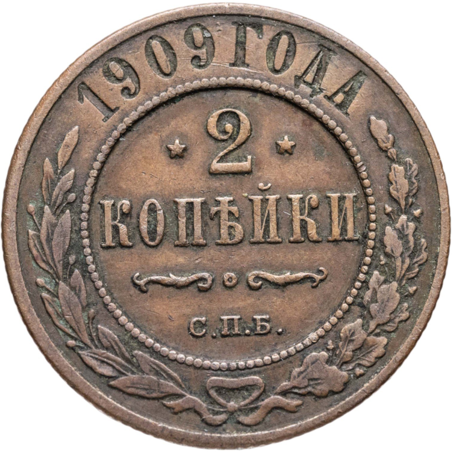 В центре указан номинал — цифра «2», ограниченная с обеих сторон звездочками. Под цифрой номинала — слово "КОПЕЙКИ". Ниже, расположен декоративный разделитель в виде двух изогнутых линий и небольшой окружности между ними. Под разделителем — обозначение монетного двора «С.П.Б.». Центральная часть отделена от остального изображения, окружностью в виде точек. В верхней части полукругом углубленная надпись: "1909 ГОДА". Ниже этой надписи, вдоль канта, изображен венок из лавровой и дубовой ветвей, которые, в нижней части, перевязаны лентой на узел бантом.