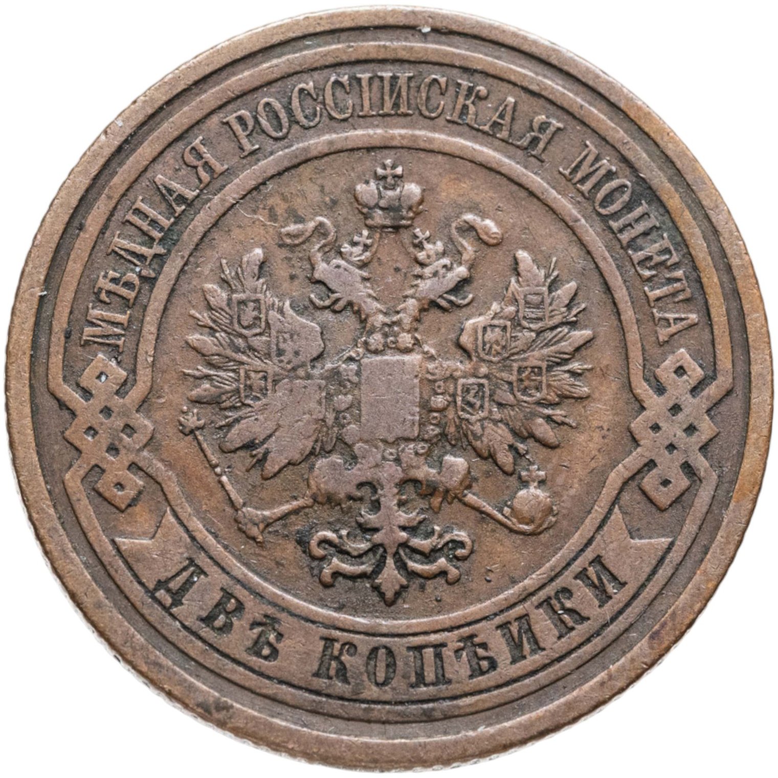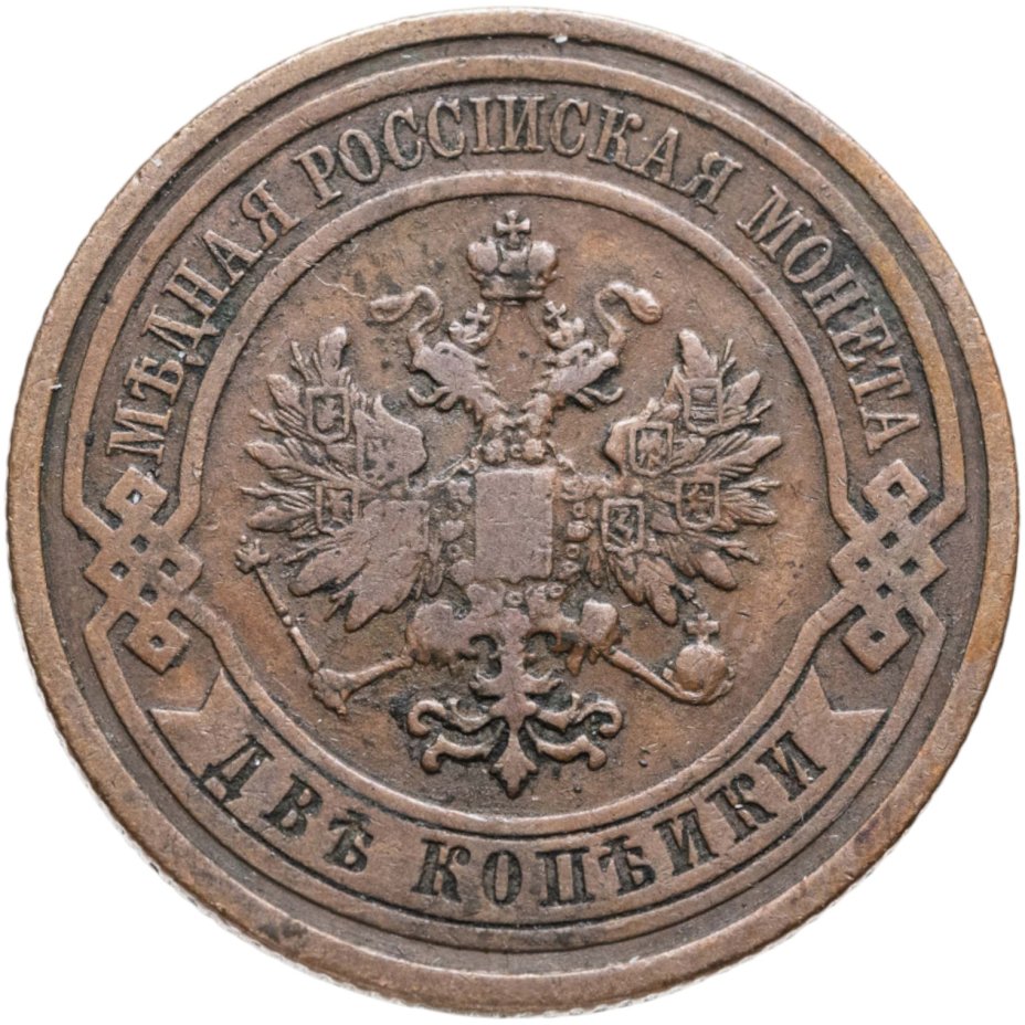В центре монеты изображен Малый Государственный Герб Российской империи - двуглавый орел, головы которого увенчаны двумя коронами, третья, большая корона над ними. Все они соединены лентой Андрея Первозванного. В правой лапе орла – скипетр, в левой – держава. На его груди расположен Московский герб, в щите изображен Георгий Победоносец с копьем поражающий дракона. Вокруг щита цепь ордена Св. Апостола Андрея Первозванного. На крыльях орла изображены гербы: Царства Казанского, Польского, Херсонеса Таврического, Астраханского, Сибирского, Грузинского и герб соединенных княжеств Киевского, Новгородского и Владимирского — по 4 на каждое крыло. По окружности - две полукруглые плашки, соединенные узорами. На верхней плашке выпуклая надпись: "МЕДНАЯ РОССИЙСКАЯ МОНЕТА". На нижней плашке, изображенной в виде ленты, углубленная надпись: "ДВЕ КОПЕЙКИ".