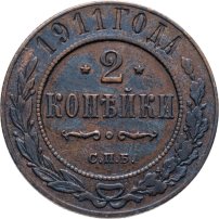 В центре указан номинал — цифра «2», ограниченная с обеих сторон звездочками. Под цифрой номинала — слово "КОПЕЙКИ". Ниже, расположен декоративный разделитель в виде двух изогнутых линий и небольшой окружности между ними. Под разделителем — обозначение монетного двора «С.П.Б.». Центральная часть отделена от остального изображения, окружностью в виде точек. В верхней части полукругом углубленная надпись: "1911 ГОДА". Ниже этой надписи, вдоль канта, изображен венок из лавровой и дубовой ветвей, которые, в нижней части, перевязаны лентой на узел бантом.