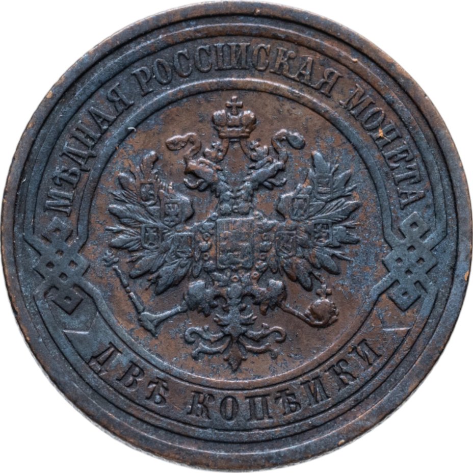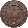 В центре монеты изображен Малый Государственный Герб Российской империи - двуглавый орел, головы которого увенчаны двумя коронами, третья, большая корона над ними. Все они соединены лентой Андрея Первозванного. В правой лапе орла – скипетр, в левой – держава. На его груди расположен Московский герб, в щите изображен Георгий Победоносец с копьем поражающий дракона. Вокруг щита цепь ордена Св. Апостола Андрея Первозванного. На крыльях орла изображены гербы: Царства Казанского, Польского, Херсонеса Таврического, Астраханского, Сибирского, Грузинского и герб соединенных княжеств Киевского, Новгородского и Владимирского — по 4 на каждое крыло. По окружности - две полукруглые плашки, соединенные узорами. На верхней плашке выпуклая надпись: "МЕДНАЯ РОССИЙСКАЯ МОНЕТА". На нижней плашке, изображенной в виде ленты, углубленная надпись: "ДВЕ КОПЕЙКИ".