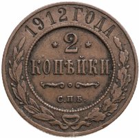 В центре указан номинал — цифра «2», ограниченная с обеих сторон звездочками. Под цифрой номинала — слово "КОПЕЙКИ". Ниже, расположен декоративный разделитель в виде двух изогнутых линий и небольшой окружности между ними. Под разделителем — обозначение монетного двора «С.П.Б.». Центральная часть отделена от остального изображения, окружностью в виде точек. В верхней части полукругом углубленная надпись: "1912 ГОДА". Ниже этой надписи, вдоль канта, изображен венок из лавровой и дубовой ветвей, которые, в нижней части, перевязаны лентой на узел бантом.