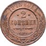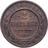 В центре монеты изображен Малый Государственный Герб Российской империи - двуглавый орел, головы которого увенчаны двумя коронами, третья, большая корона над ними. Все они соединены лентой Андрея Первозванного. В правой лапе орла – скипетр, в левой – держава. На его груди расположен Московский герб, в щите изображен Георгий Победоносец с копьем поражающий дракона. Вокруг щита цепь ордена Св. Апостола Андрея Первозванного. На крыльях орла изображены гербы: Царства Казанского, Польского, Херсонеса Таврического, Астраханского, Сибирского, Грузинского и герб соединенных княжеств Киевского, Новгородского и Владимирского — по 4 на каждое крыло. По окружности - две полукруглые плашки, соединенные узорами. На верхней плашке выпуклая надпись: "МЕДНАЯ РОССИЙСКАЯ МОНЕТА". На нижней плашке, изображенной в виде ленты, углубленная надпись: "ДВЕ КОПЕЙКИ".