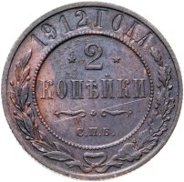 В центре указан номинал — цифра «2», ограниченная с обеих сторон звездочками. Под цифрой номинала — слово "КОПЕЙКИ". Ниже, расположен декоративный разделитель в виде двух изогнутых линий и небольшой окружности между ними. Под разделителем — обозначение монетного двора «С.П.Б.». Центральная часть отделена от остального изображения, окружностью в виде точек. В верхней части полукругом углубленная надпись: "1912 ГОДА". Ниже этой надписи, вдоль канта, изображен венок из лавровой и дубовой ветвей, которые, в нижней части, перевязаны лентой на узел бантом.