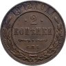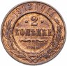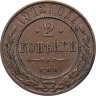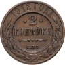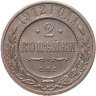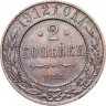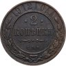 В центре монеты изображен Малый Государственный Герб Российской империи - двуглавый орел, головы которого увенчаны двумя коронами, третья, большая корона над ними. Все они соединены лентой Андрея Первозванного. В правой лапе орла – скипетр, в левой – держава. На его груди расположен Московский герб, в щите изображен Георгий Победоносец с копьем поражающий дракона. Вокруг щита цепь ордена Св. Апостола Андрея Первозванного. На крыльях орла изображены гербы: Царства Казанского, Польского, Херсонеса Таврического, Астраханского, Сибирского, Грузинского и герб соединенных княжеств Киевского, Новгородского и Владимирского — по 4 на каждое крыло. По окружности - две полукруглые плашки, соединенные узорами. На верхней плашке выпуклая надпись: "МЕДНАЯ РОССИЙСКАЯ МОНЕТА". На нижней плашке, изображенной в виде ленты, углубленная надпись: "ДВЕ КОПЕЙКИ".