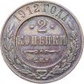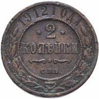 В центре указан номинал — цифра «2», ограниченная с обеих сторон звездочками. Под цифрой номинала — слово "КОПЕЙКИ". Ниже, расположен декоративный разделитель в виде двух изогнутых линий и небольшой окружности между ними. Под разделителем — обозначение монетного двора «С.П.Б.». Центральная часть отделена от остального изображения, окружностью в виде точек. В верхней части полукругом углубленная надпись: "1912 ГОДА". Ниже этой надписи, вдоль канта, изображен венок из лавровой и дубовой ветвей, которые, в нижней части, перевязаны лентой на узел бантом.