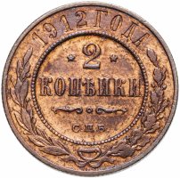 В центре указан номинал — цифра «2», ограниченная с обеих сторон звездочками. Под цифрой номинала — слово "КОПЕЙКИ". Ниже, расположен декоративный разделитель в виде двух изогнутых линий и небольшой окружности между ними. Под разделителем — обозначение монетного двора «С.П.Б.». Центральная часть отделена от остального изображения, окружностью в виде точек. В верхней части полукругом углубленная надпись: "1912 ГОДА". Ниже этой надписи, вдоль канта, изображен венок из лавровой и дубовой ветвей, которые, в нижней части, перевязаны лентой на узел бантом.