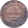 В центре монеты изображен Малый Государственный Герб Российской империи - двуглавый орел, головы которого увенчаны двумя коронами, третья, большая корона над ними. Все они соединены лентой Андрея Первозванного. В правой лапе орла – скипетр, в левой – держава. На его груди расположен Московский герб, в щите изображен Георгий Победоносец с копьем поражающий дракона. Вокруг щита цепь ордена Св. Апостола Андрея Первозванного. На крыльях орла изображены гербы: Царства Казанского, Польского, Херсонеса Таврического, Астраханского, Сибирского, Грузинского и герб соединенных княжеств Киевского, Новгородского и Владимирского — по 4 на каждое крыло. По окружности - две полукруглые плашки, соединенные узорами. На верхней плашке выпуклая надпись: "МЕДНАЯ РОССИЙСКАЯ МОНЕТА". На нижней плашке, изображенной в виде ленты, углубленная надпись: "ДВЕ КОПЕЙКИ".