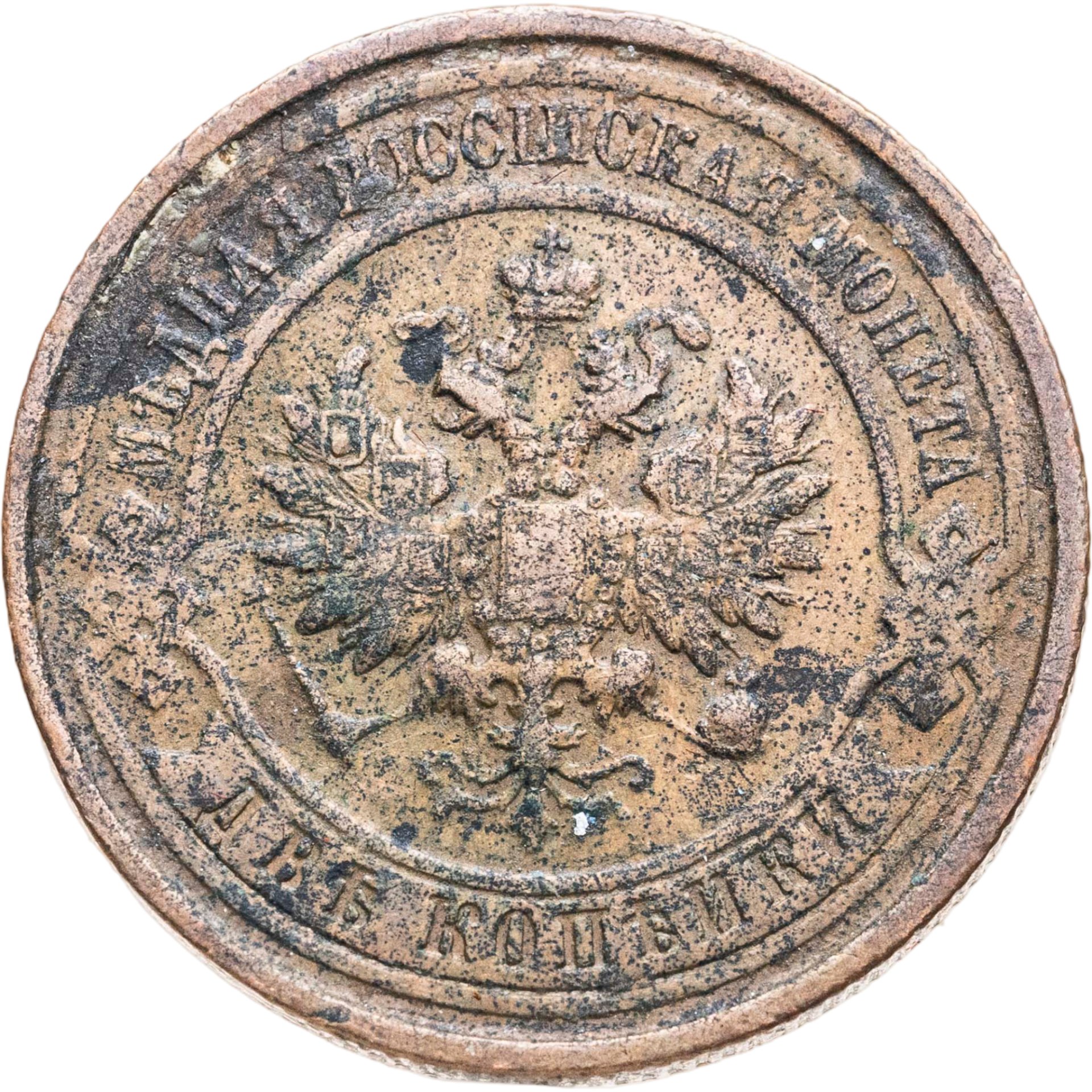 В центре монеты изображен Малый Государственный Герб Российской империи - двуглавый орел, головы которого увенчаны двумя коронами, третья, большая корона над ними. Все они соединены лентой Андрея Первозванного. В правой лапе орла – скипетр, в левой – держава. На его груди расположен Московский герб, в щите изображен Георгий Победоносец с копьем поражающий дракона. Вокруг щита цепь ордена Св. Апостола Андрея Первозванного. На крыльях орла изображены гербы: Царства Казанского, Польского, Херсонеса Таврического, Астраханского, Сибирского, Грузинского и герб соединенных княжеств Киевского, Новгородского и Владимирского — по 4 на каждое крыло. По окружности - две полукруглые плашки, соединенные узорами. На верхней плашке выпуклая надпись: "МЕДНАЯ РОССИЙСКАЯ МОНЕТА". На нижней плашке, изображенной в виде ленты, углубленная надпись: "ДВЕ КОПЕЙКИ".