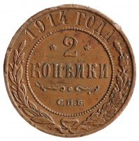 В центре указан номинал — цифра «2», ограниченная с обеих сторон звездочками. Под цифрой номинала — слово "КОПЕЙКИ". Ниже, расположен декоративный разделитель в виде двух изогнутых линий и небольшой окружности между ними. Под разделителем — обозначение монетного двора «С.П.Б.». Центральная часть отделена от остального изображения, окружностью в виде точек. В верхней части полукругом углубленная надпись: "1914 ГОДА". Ниже этой надписи, вдоль канта, изображен венок из лавровой и дубовой ветвей, которые, в нижней части, перевязаны лентой на узел бантом.