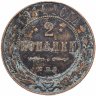 В центре монеты изображен Малый Государственный Герб Российской империи - двуглавый орел, головы которого увенчаны двумя коронами, третья, большая корона над ними. Все они соединены лентой Андрея Первозванного. В правой лапе орла – скипетр, в левой – держава. На его груди расположен Московский герб, в щите изображен Георгий Победоносец с копьем поражающий дракона. Вокруг щита цепь ордена Св. Апостола Андрея Первозванного. На крыльях орла изображены гербы: Царства Казанского, Польского, Херсонеса Таврического, Астраханского, Сибирского, Грузинского и герб соединенных княжеств Киевского, Новгородского и Владимирского — по 4 на каждое крыло. По окружности - две полукруглые плашки, соединенные узорами. На верхней плашке выпуклая надпись: "МЕДНАЯ РОССИЙСКАЯ МОНЕТА". На нижней плашке, изображенной в виде ленты, углубленная надпись: "ДВЕ КОПЕЙКИ".