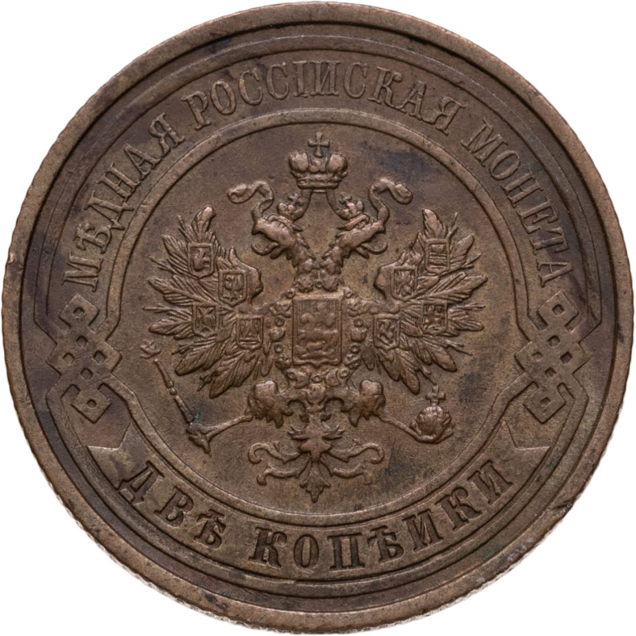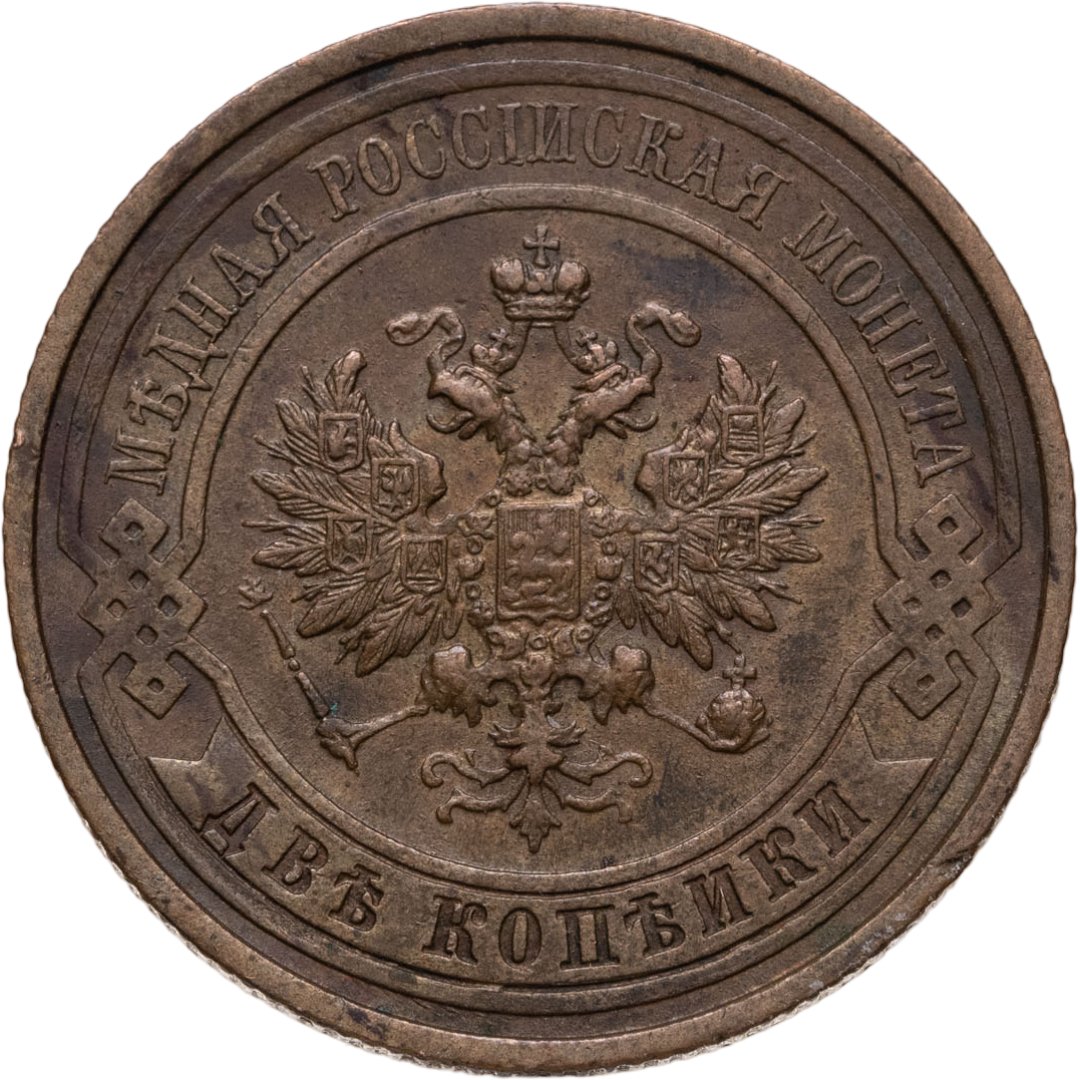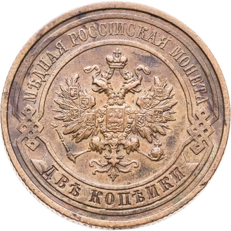 В центре монеты изображен Малый Государственный Герб Российской империи - двуглавый орел, головы которого увенчаны двумя коронами, третья, большая корона над ними. Все они соединены лентой Андрея Первозванного. В правой лапе орла – скипетр, в левой – держава. На его груди расположен Московский герб, в щите изображен Георгий Победоносец с копьем поражающий дракона. Вокруг щита цепь ордена Св. Апостола Андрея Первозванного. На крыльях орла изображены гербы: Царства Казанского, Польского, Херсонеса Таврического, Астраханского, Сибирского, Грузинского и герб соединенных княжеств Киевского, Новгородского и Владимирского — по 4 на каждое крыло. По окружности - две полукруглые плашки, соединенные узорами. На верхней плашке выпуклая надпись: "МЕДНАЯ РОССИЙСКАЯ МОНЕТА". На нижней плашке, изображенной в виде ленты, углубленная надпись: "ДВЕ КОПЕЙКИ".